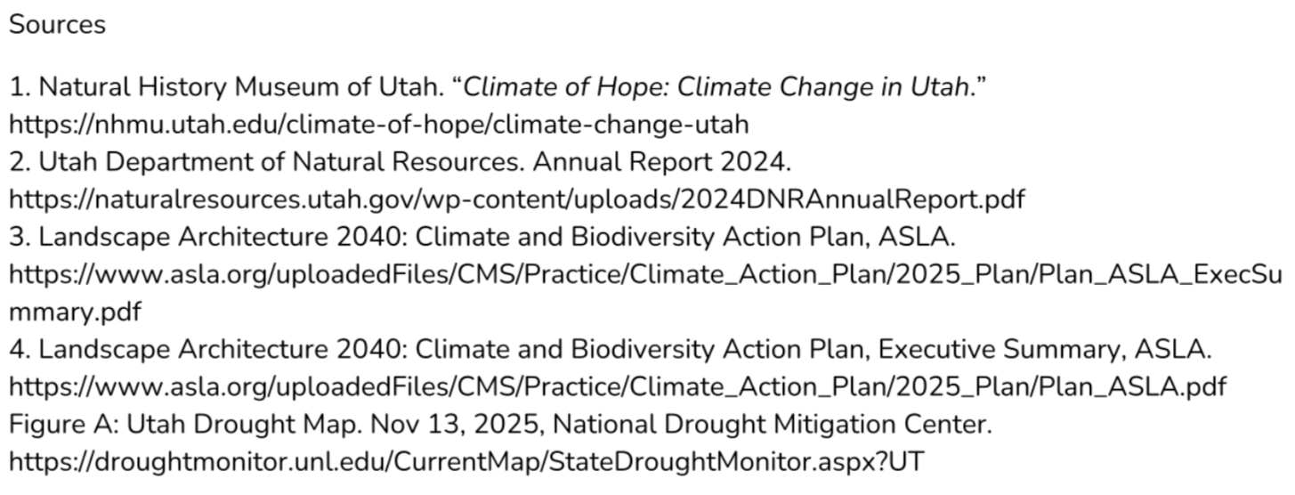 As Chair, my goals this year include sharing tools from the new plan, highlighting Utah-based examples of climate and biodiversity positive design, and coordinating with our regional partners and academic programs. I will also be reaching out to members who wish to contribute expertise, case studies, or ideas for educational events and collaborative initiatives. Our chapter has an opportunity to lead regional conversations about climate resilience, ecological restoration, and community health, all grounded in the landscape architecture profession. I look forward to working with all of you over the coming year!