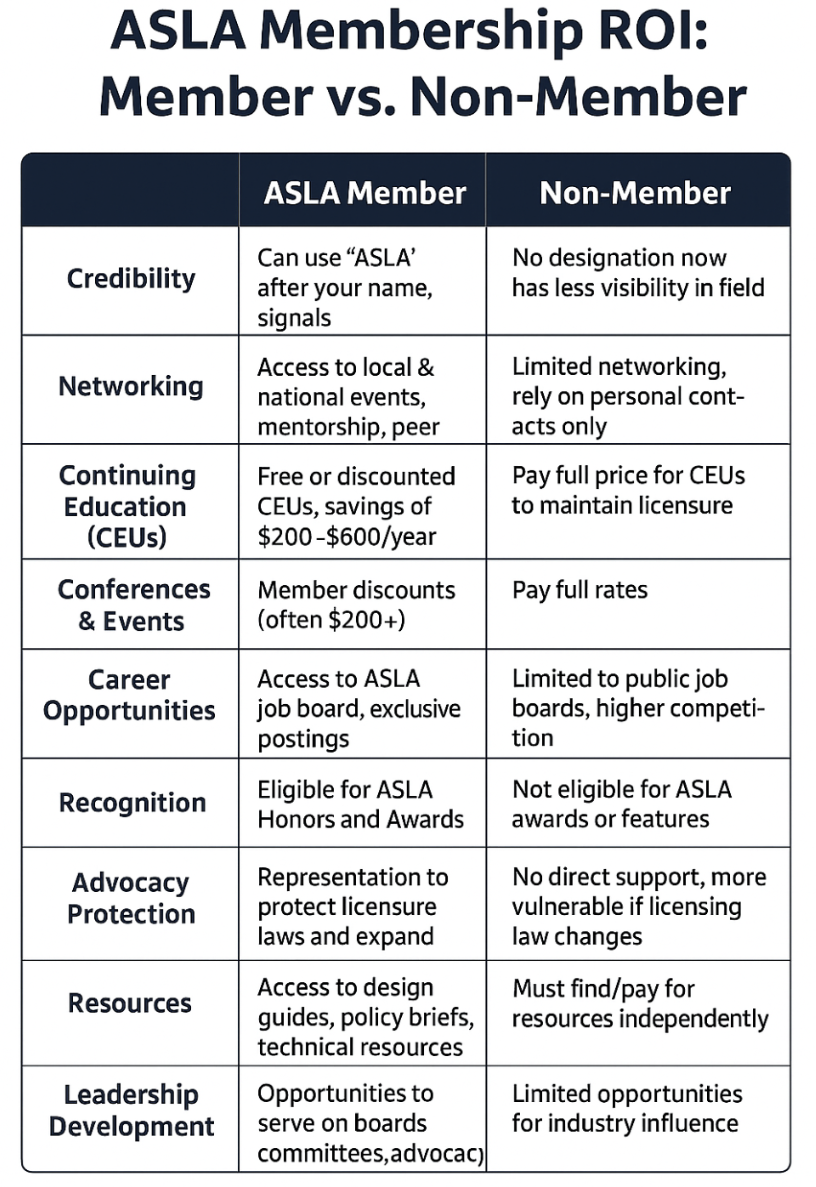 One recent conversation stands out. A colleague asked me to explain the value of ASLA membership. It caught me off guard—not because it’s hard to explain, but because this individual isn’t a member, yet uses “ASLA” after their name. That moment reminded me how important it is to understand and communicate the return on investment of membership. Below is a short list of benefits— it’s not exhaustive, a little messy but there’s real value there: