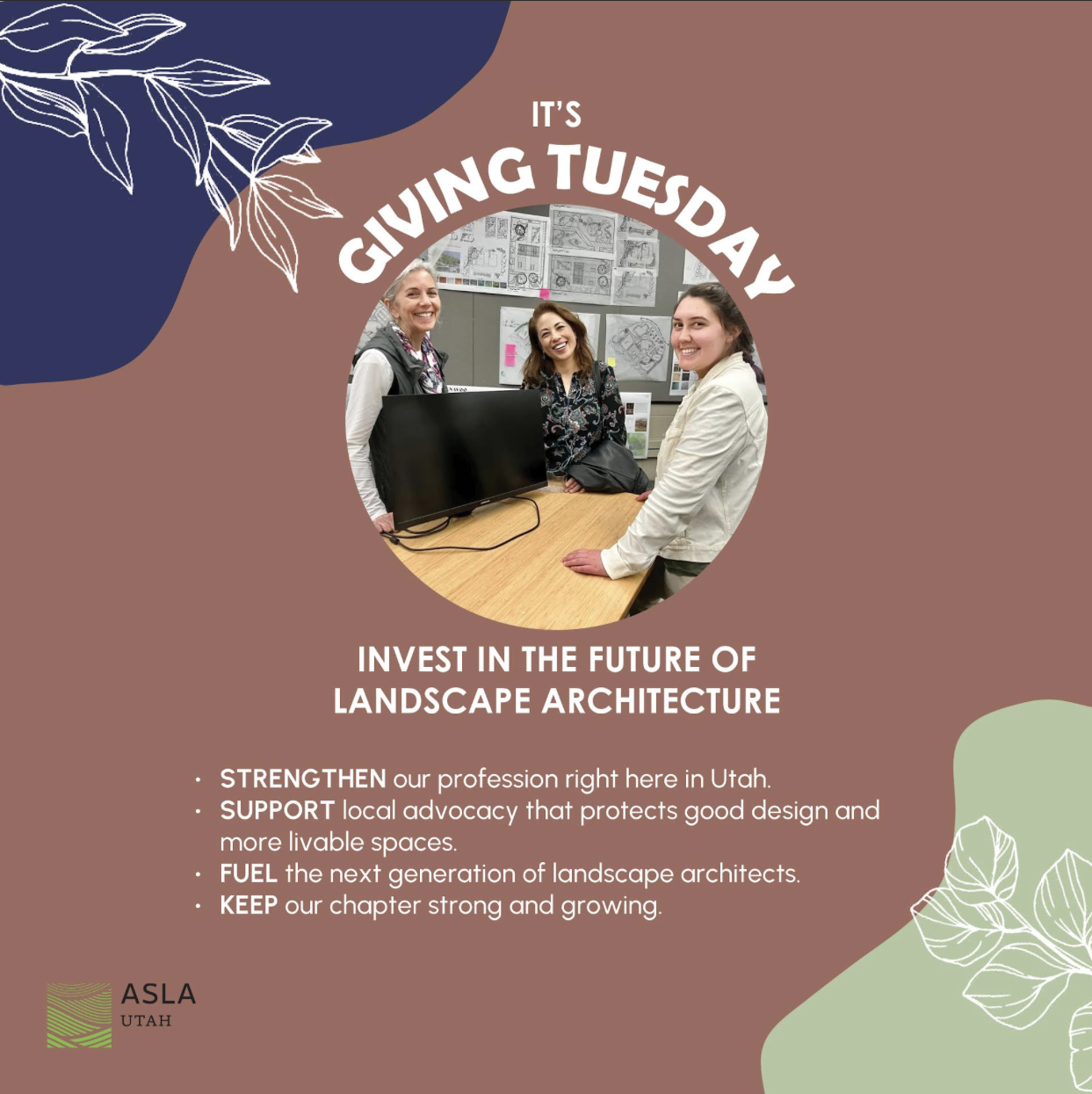 This #GivingTuesday This year the Utah Chapter of the ASLA is hoping you and/or your firm will consider giving to support the important work of the ASLA Utah Chapter. The Chapter works to promote the profession of landscape architecture and support your business, career, and future right here in Utah. 100% of your donation stays with the Utah Chapter and helps support the important efforts of the Utah Chapter.